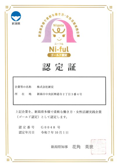 当社は、令和7年度から新潟県が新たに導入した「多様で柔軟な働き方・女性活躍実践企業認定制度『Ni-ful(ニーフル)』」において、「Ni-fulゴールド認定」を2025年10月1日付で取得いたしました。